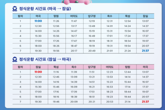 | 예매 방법 | 공식 홈페이지 한강버스 사이트 또는 현장 발권 |