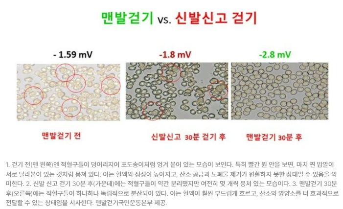30분 맨발걷기 전후 혈액 상태에 놀라운 변화가 있었습니다.