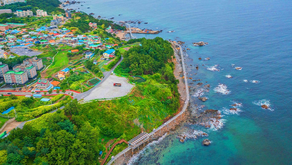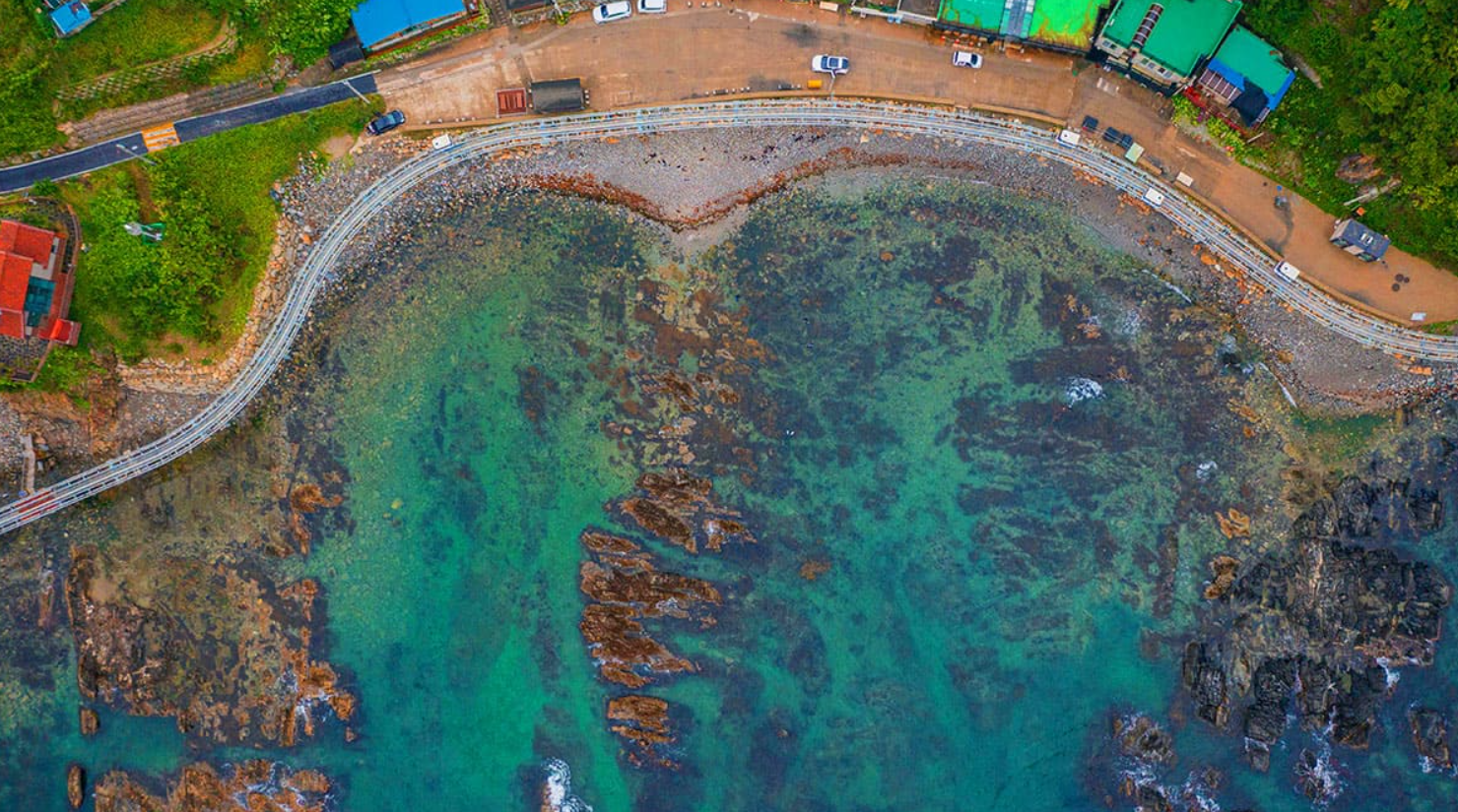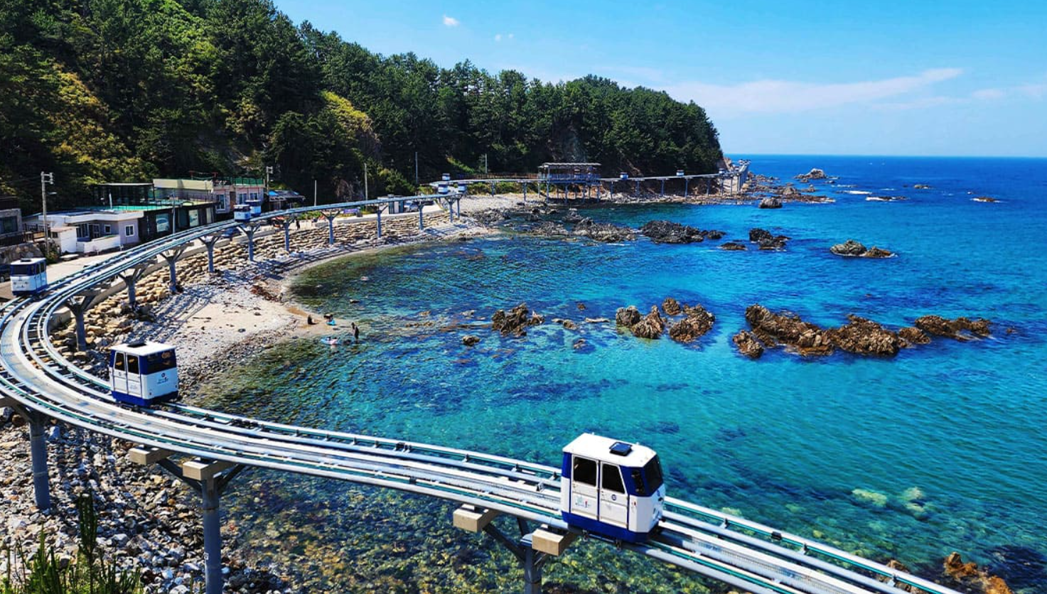 죽변해안스카이레일은 동해의 푸른 물결과 하늘, 그리고 울창한 산세가 어우러진 풍경 속을 시속 5km의 느긋한 속도로 이동하는 해양 모노레일입니다.