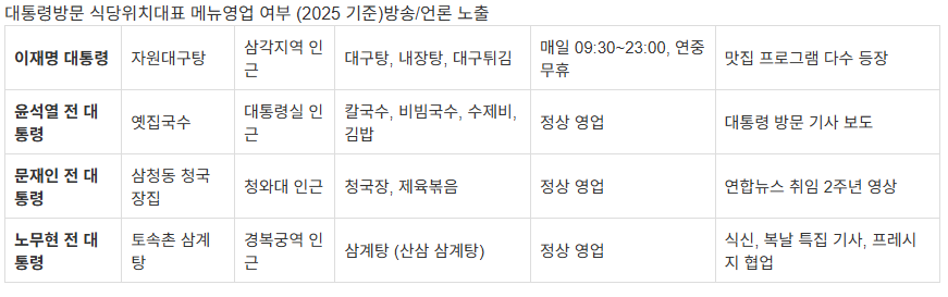 최근 이재명 대통령의 삼각지 대구탕 방문으로 다시 주목받고 있는 ‘대통령 맛집’ 리스트를 최신 영업 여부와 방송 노출 정보까지 정리해 소개합니다.
