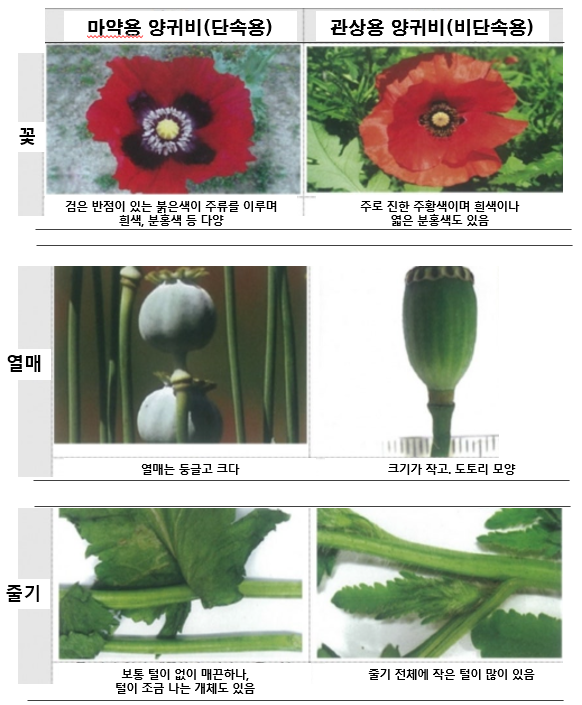 - 마약류 양귀비: 줄기 매끈, 털 거의 없음, 꽃잎에 점, 열매 둥글고 큼