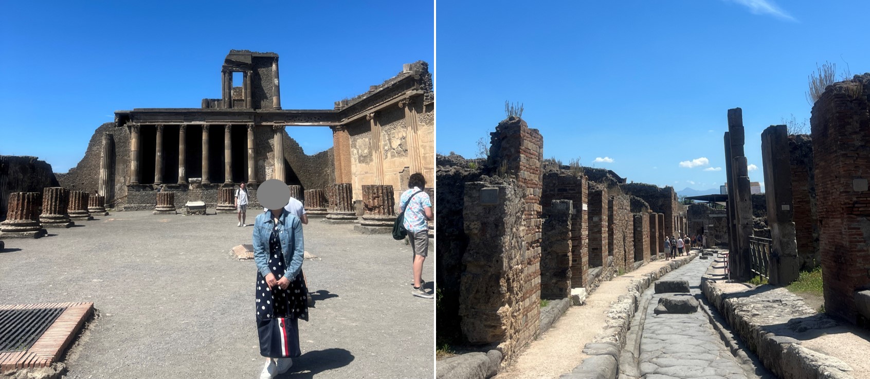 직접 폼페이 유적지를 거닐다 보면, 2000년 전 이곳에서 사람들이 어떤 삶을 살았는지 고스란히 느껴질 만큼 잘 보존된 거리와 건축물이 인상적이에요. 자갈로 포장된 도로, 하수도 시설, 포럼과 원형극장, 여관과 마구간까지… 심지어 지금의 카페테리아 같은 선술집도 곳곳에 남아 있어, 당시 사람들의 일상을 엿볼 수 있습니다.