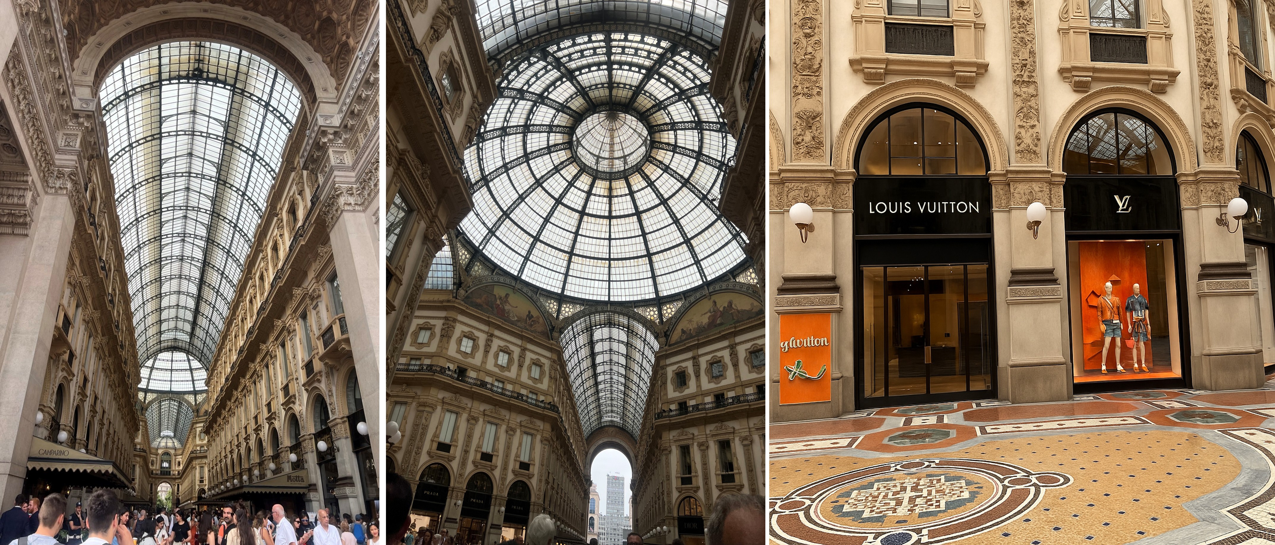 천장을 덮은 거대한 유리 아케이드와 대리석 바닥, 고풍스러운 벽화와 정교한 장식들이 어우러져 마치 하나의 미술관 같은 분위기를 연출합니다. 내부에는 명품 부티크와 전통 카페가 줄지어 있어 쇼핑뿐 아니라 잠시 쉬며 커피 한 잔 즐기기에도 완벽했습니다.
