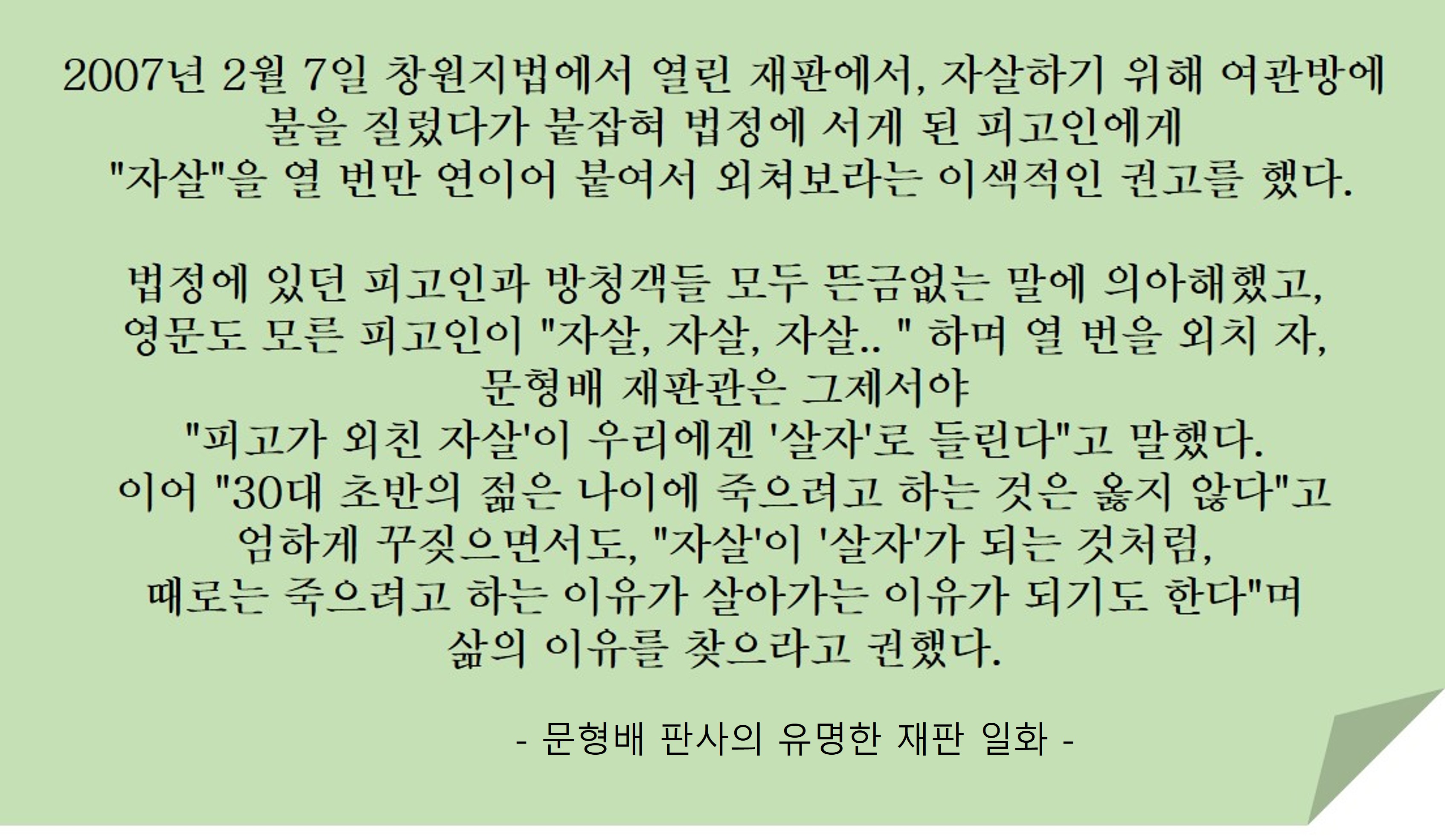 그는 법정에서도 따뜻함을 잃지 않았습니다. 2007년, 자살을 시도한 피고인에게 법정에서 '자살'을 열 번 외치게 한 뒤,
