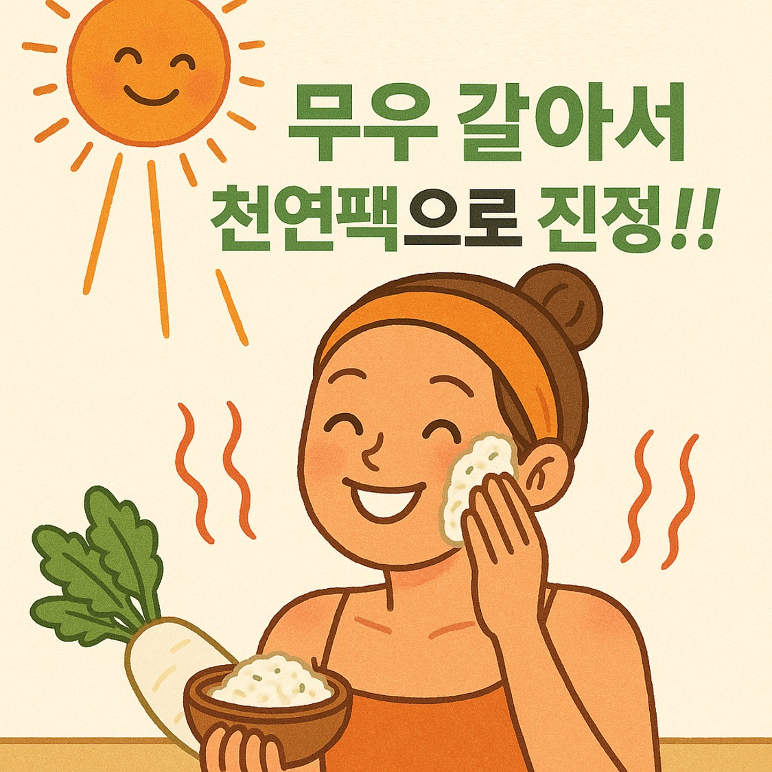 특히 **비타민이 풍부한 무(무우)**를 갈아 만든 팩이 제 피부에 정말 잘 맞았는데요. 달아오른 피부 열감이 한결 가라앉고, 덤으로 여드름 피부에도 의외로 진정 효과를 볼 수 있었습니다. 무에 가득 들어 있는 비타민 C와 수분, 그리고 피부를 다독여주는 진정 성분 덕분인지 팩을 하고 나면 피부가 한결 편안해지더라고요.
