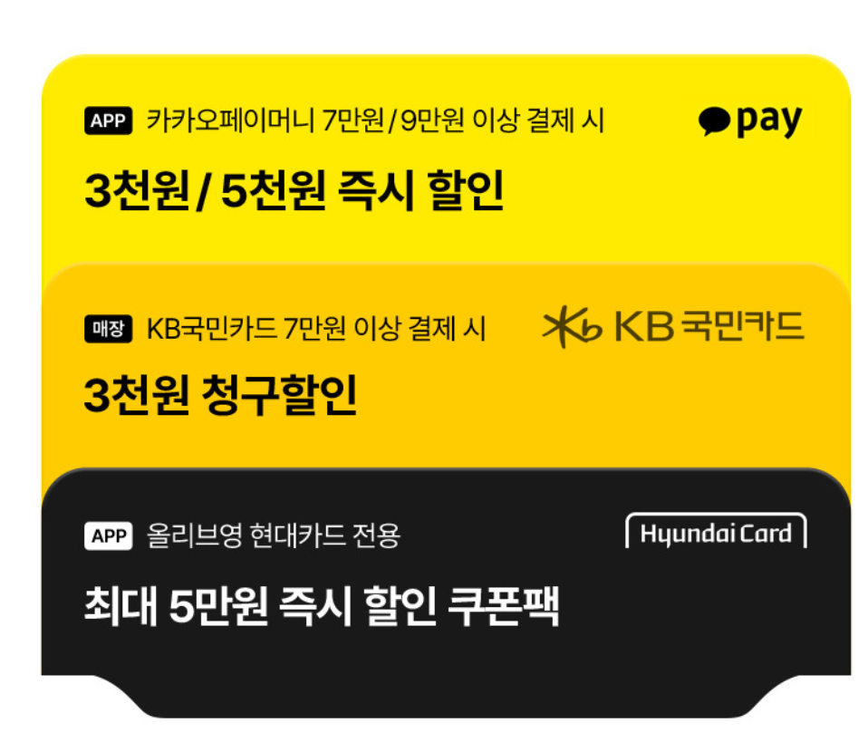 - 올리브영 현대카드: 최대 5만원 즉시 할인 쿠폰팩 제공