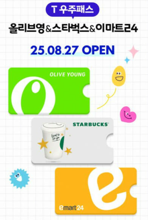 SK텔레콤이 8월 27일부터 T 우주에서 생활밀착형 구독 상품 **‘T 우주패스 올리브영&스타벅스&이마트24’**를 선보입니다. 월 9,900원으로 세 가지 인기 브랜드 혜택을 한 번에 누릴 수 있습니다.